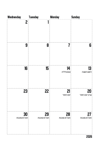 Wednesday Tuesday Monday Sunday 21 9876 13 14 15 16 ראש השנה צום גדליה 20 21 22 23 ערב יום כיפור יום כיפור 27 28 29 30 חוה”מ סוכות חוה”מ סוכות חוה”מ סוכות חוה”מ סוכות 2026