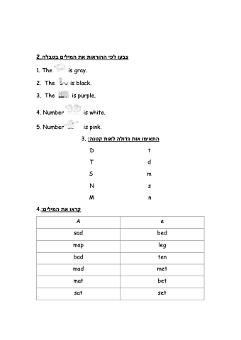 צבעו לפי ההוראות את המילים בטבלה .2 1. The is gray. 2. The is black. 3. The is purple. 4. Number is white. 5. Number is pink. התאימו אות גדולה לאות קטנה: .3 D t T d S m N s M n קראו את המילים: .4 A e sad bed map leg bad ten mad met mat bet sat set