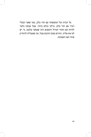 כל הבית וכל המשפחה עִם חור בלב, כמו שאני ובעִלי דביר עִם חור בלב. גדלנו כולם ביחד. אבל אנחנו נלמד לחיות עִם החור הגדול והעִצום הזה שנפעִר בלבנו, כי יש לנו את אליה. החיים בסוף חזקים מכל. מה שמצליח להחזיק אותי זאת האמונה. 98