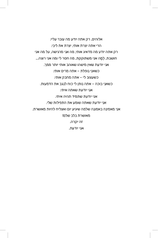 רקָ אתהַ יוֹדִּע מָּהַ מָּדִּאיג אוֹתי, מָּהַ אנִי מָּרגישֶׁהַ, עלְ מָּהַ אנִי חוֹשֶׁבת, ְלְ ָמָּהַ אנִי מָּשֶׁתוֹקָקָת, מָּהַ חסר לְי וֹמָּהַ אנִי רוֹצַהַ... אנִי יוֹדִּעת שֶׁאין מָּישֶׁהַוֹ שֶׁאוֹהַב אוֹתי יוֹתר מָּמָּךָ.
