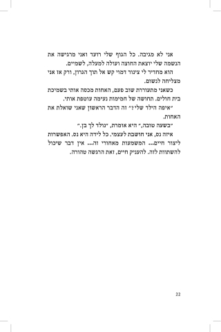 ״בשעִה טובה,״ היא אומרת, ״נולד לך בן.״ איזה נס, אני חושבת לעִצמי. כל לידה היא נס. האפשרות ליצור חיים... המשמעִות מאחורי זה... אין דבר שיכול