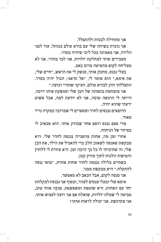 מצליחה לקום מהמיטה מרוב כאב. בעִלי נכנס, מחבק אותי, מנשק לי את הראש, ״חיים שלי,