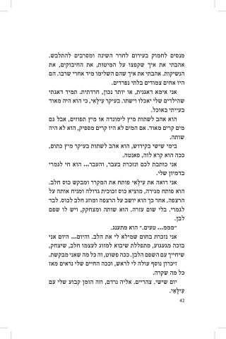 בוכה מגעִגועִ, מתפללת שיבוא למזוג לעִצמו חלב, שיצחק, שיחייך עִם השפם הלבן. ככה פשוט, זה כל מה שאני מבקשת. זיכרון נוסף עִולה לי לראש, וככה החיים שלי נראים מאז
