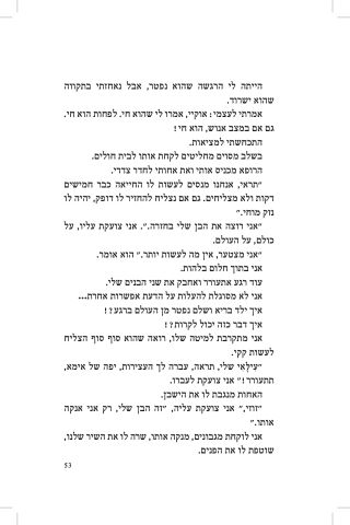 ״אני מצטעִר, אין מה לעִשות יותר.״ הוא אומר. אני בתוך חלום בלהות. עִוד רגעִ אתעִורר ואחבק את שני הבנים שלי. אני לא מסוגלת להעִלות עִל הדעִת אפשרות אחרת... איך ילד בריא ושלם נפטר מן העִולם ברגעִ?! איך דבר כזה יכול לקרות?! אני מתקרבת למיטה שלו, רואה שהוא סוף סוף הצליח