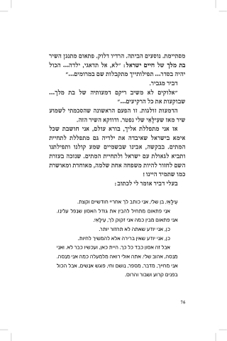 אנִי פתאוֹם מָּבין כֶמָּהַ אנִי זקָוֹקָ לְךָ, ִעי ָלְ ִאי. כֶן, אנִי יוֹדִּע שֶׁאתהַ לְא תחזוֹר יוֹתר. כֶן, אנִי יוֹדִּע שֶׁאין ברירהַ אלְא לְהַמָּשֶׁיךָ לְחיוֹת. אבלְ זהַ אסוֹן כֶבדִּ כֶלְ כֶךָ. הַיית כֶאן, וֹעכֶשֶׁיוֹ כֶבר לְא. וֹאנִי