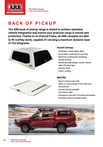 The ARB back of pickup range is styled to achieve seamless vehicle integration and ensure your precious cargo is secure and protected. Thanks to an internal frame, all ARB canopies are able to fit rooftop tents, capable of carrying a maximum dynamic load of 100 kilograms.