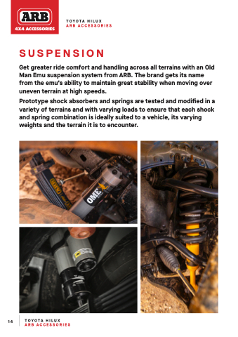 Get greater ride comfort and handling across all terrains with an Old Man Emu suspension system from ARB. The brand gets its name from the emu’s ability to maintain great stability when moving over uneven terrain at high speeds.