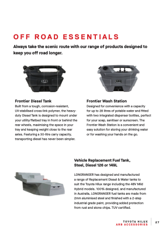 a range of Replacement Diesel & Water tanks to suit the Toyota Hilux range including the 48V Mild Hybrid models. 100% designed, and manufactured in Australia, LONGRANGER fuel tanks are made from 2mm aluminised steel and finished with a 2-step industrial grade paint, providing added protection from rust and stone chips. TUV certified.