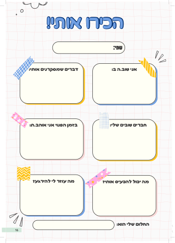 הכירו אותי! הכירו אותי! דברים שמסקרנים אותי: שמי: אני טוב.ה ב: בזמן הפנוי אני אוהב.ת: מה יכול להכעיס אותי? מה עוזר לי להירגע? חברים טובים שלי: החלום שלי הוא: 16