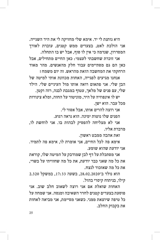 אני יודעִת שהוא שומעִ. אני מסתכלת עִל דף לבן שמודבק עִל המיטה שלו, קוראת