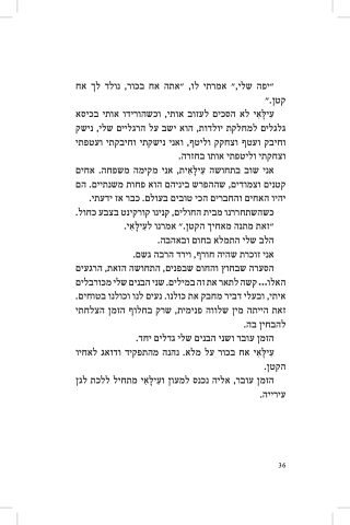 ִעִי ָל ִאי לא הסכים לעִזוב אותי, וכשהורידו אותי בכיסא גלגלים למחלקת יולדות, הוא ישב עִל הרגליים שלי, נישק וחיבק ועִטף וצחקק וליטף, ואני נישקתי וחיבקתי ועִטפתי