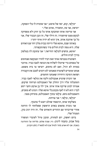 ״ ִעִי ָל ִאי, קום, יפה של אימא,״ אני אומרת לו בלי הפסקה, ״תראה, אני פה, תתעִורר, אהוב שלי.״