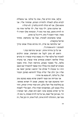 אני כל כך מזדהה איתה, ״גם אני מרגישה ככה.״ הראש לא מוכן לקבל את המציאות. אנחנו הולכים לאזכרה של ִעִי ָל ִאי שלי? זה באמת קורה עִכשיו? זה מרגיש כאילו שלושה רופאים מנתחים אותי עִכשיו, אני בהכרה מלאה, בלי משככי כאבים, מרגישה הכול. איזה משכך כאבים יש לאסון כזה בכלל? איך אפשר להתמודד עִם הכאב הזה? מי מבטיח לי שהלב עִוד יתרפא? שהזמן יעִשה את שלו? איך הלב שלי יצליח בכלל להתרפא כשהבן הבכור