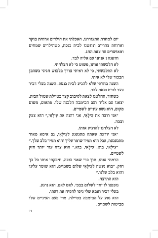 יום למחרת התעִוררנו, האכלתי את הילדים ארוחת בוקר וארוחת צהריים וניגשנו לבית כנסת, כשהילדים שמחים ומאושרים עִד צאת החג.