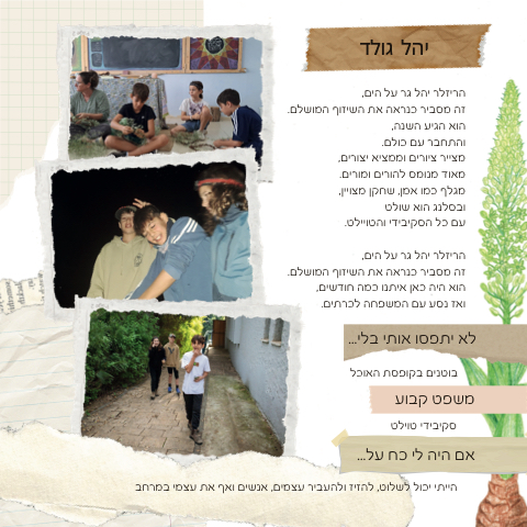 הריזלר יהל גר על הים, זה מסביר כנראה את השיזוף המושלם. הוא הגיע השנה, והתחבר עם כולם. מצייר ציורים וממציא יצורים, מאוד מנומס להורים ומורים. מגלף כמו אמן, שחקן מצויין, ובסלנג הוא שולט עם כל הסקיבידי והטויילט.