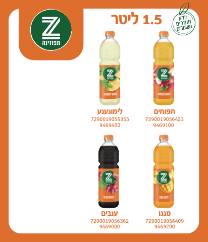 1.5 ליטר לימונענע 7290019056355 9469400 ענבים 7290019056362 9469000 תפוחים 7290019056423 9469100 מנגו 7290019056409 9469200
