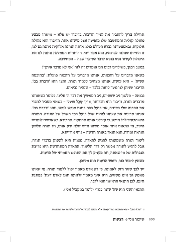 נבואה - מלשון ניב שפתיים, ניב הממשיך את דבר ה' אלינו. כלומר כשאנחנו מדבריםתורה,ודיבורהואחברותה,צריך ֶשֶֹכלפועל1-כשאנימסבירלחברי את ההבנה שלי בסוגיה, אני פועל בפה פתוח מנפש לנפש, וזהו 'ודברת בם'. אנחנו מכינים את עצמנו להיות שכל פועל כמו השכל של התורה. התורה היא הבסיס לכל חופש, כי קיבלנו אותה מהמקור, מהבורא. כשאנשים לומדים היטב, אז פתאום אחד אומר משהו חדש שלא ידע אותו, וזו תורה מלשון