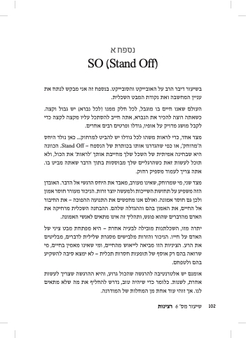 מצד אחד, כדי לראות משהו לכל גודלו יש להביט למרחוק... כאן נולד היחס ה'מרוחק', או כפי שהגדרנו אותו בכותרת של הנספח - Stand Off. הכוונה היא שבחינה אמיתית של השכל שלך מחייבת אותך 'לראות' את הכול, ולא תוכל לעשות זאת כשהרגליים שלך מבוססות בתוך הדבר שאתה מביט בו.