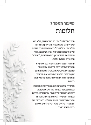 המצב ה"חלומי" אינו רק מנוחה לגוף, אלא הוא שער לעולם של תובנות שההיגיון היום-יומי שלנו אינו יכול להכיל. בערות המחשבה הלוגית שלנו פועלת כשומר סף, והיא מציבה מגבלות וסייגים על הנשמה. אך כשאנו ישנים, "השומר" הזה נרדם והשער נפתח.
