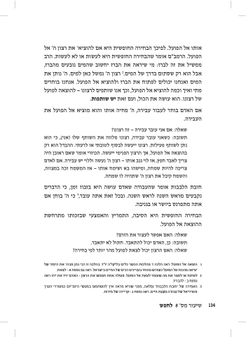 אותו אל הפועל. לפיכך הבחירה החופשית היא אם להוציא1 את רצון ה' אל הפועל. הרמב"ם אומר שהבחירה החופשית היא לעשות או לא לעשות. הרב ממשיל את זה לברז: מי שיראה את הברז יחשוב שהמים נובעים מהברז, אבל הוא רק שסתום בדרך של המים.2 רצון ה' נמשל כאן למים. ה' נותן את המים ואנחנו יכולים לפתוח את הברז ולהוציא אל הפועל. אנחנו בוחרים מתי ואיך וכמה להוציא אל הפועל, וכך אנו שותפים לרצונו - להוצאה לפועל