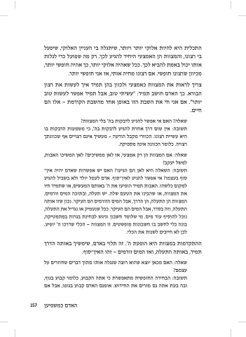 שאלה: אם המצוות הן רק אמצעי, אז לאן ממשיכים? לאן המשיכו האבות, למשל יעקב? תשובה: השאלה היא לאן הם הגיעו? האם יש אפשרות שאדם יהיה אין־ סוף בעצמו? אי אפשר להגיע לאין־סוף. אדם לעמל יולד ולא בשביל להגיע למקום כלשהו. האבות תמיד הופיעו את ה' באותם המעשים, או שתמיד חיו את המצווה, או שהבינו את הטעם שלה. יש תעלה, ובתוכה המים זורמים. המצוות הן התעלה, הן הדרך, אבל המים הזורמים הם העיקר. נכון שזו אותה התעלה, וזה בסדר, אבל המים הם העיקר. ככל שנעמיק או נגדיל את התעלה, נוכל להוסיף עוד מים. מי שלומד חשבון וניגש לבחינת בגרות במתמטיקה, בונה כלי לחשב בו חשבונות מופשטים. זו המצווה - הכלי שדרכו ה' יופיע. לכן לא חייבים לשנות את הכלי.