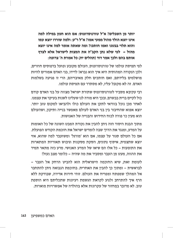 רבי עקיבא מסביר לטורנוסרופוס שתורת ישראל מצווה על בני האדם קודם כול לקיים ברית בבשרם, ובכך היא מורה לנו שעלינו לשנות בעיקר את עצמנו. לאחר מכן נוכל בוודאי לתקן את העולם כולו ולהביאו למקום טוב יותר. יוצא אפוא שהחיבור בין בני האדם לעולם מאפשר בנייה ותיקון, ושהעולם