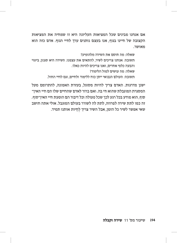שאלה: מה חוסם את השירה מלהופיע? תשובה: אנחנו צריכים לשיר, להתאים את עצמנו. השירה היא סגנון, ביטוי והבעה כלפי אחרים, ואנו צריכים להיות כאלו. שאלה: מה עושים למול הלימוד? תשובה: העולם הנבואי ייתן כוח ללימוד ולחיים, וגם לחיי החול.
