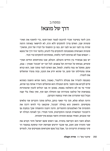 הרב לימד בשיעור שכדי להיכנס לממד האין־סופי, כדי לחשוף את האין־ סופיות שבו, האדם צריך להתקדם ללא הרף, לא להישאר באותה הרמה שהיה בה לפני רגע או לפני יום. כמו כן הוספתי על דבריו של הרב, שהאין־ סופיות האנושית משמעותה להתקדם בלי להגיע, כלומר זוהי דרך של מוצא