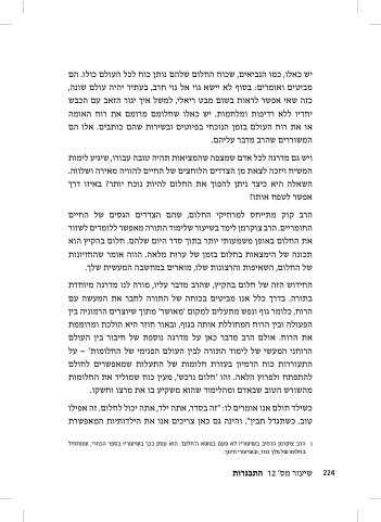 החידוש הזה של חלום בהקיץ, שהרב מדבר עליו, מורה לנו מדרגה מיוחדת בתורה. בדרך כלל אנו מביטים בכוחה של התורה לחבר את המעשה עם הרוח, כלומר גוף ונפש מתעלים למקום 'מאושר' מתוך שיוצרים הרמוניה בין הפעולה ובין הרוח המחוללת אותה בגוף, ובאור חוזר היא הולכת ומרוממת את הרוח. אולם הרב מדבר כאן על מדרגה נוספת של חיבור בין העולם הרוחני המעשי של לימוד התורה לבין העולם הפנימי של החלומות1 - על התעוררות כוח הדמיון בעזרת חלומות של התעלות שמאפשרים לחולם להתפתח ולפרוץ הלאה. זהו 'חלום נרכש', מעין כוח שמוליד את החלומות