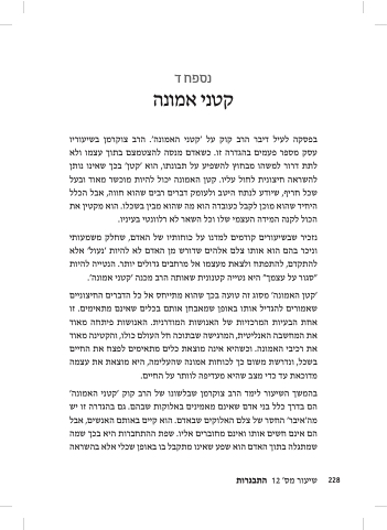 בהמשך השיעור לימד הרב צוקרמן שבלשונו של הרב קוק 'קטני האמונה' הם בדרך כלל בני אדם שאינם מאמינים באלוקות שבהם. גם בהגדרה זו יש מה'איבר' החסר של צלם האלוקים שבאדם. הוא קיים באותם האנשים, אבל הם אינם חשים אותו ואינם מחוברים אליו. שפת ההתחברות היא בכך שמה שמתגלה בתוך האדם הוא שפע שאינו מתקבל בו באופן שכלי אלא בהשראה