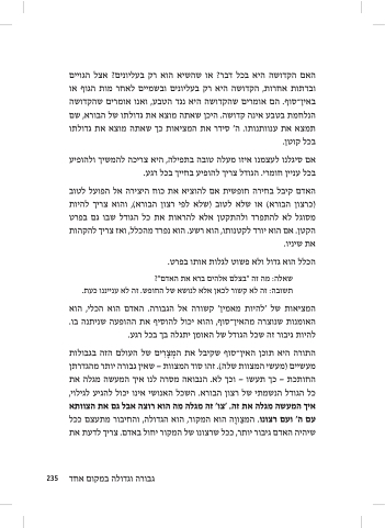 האם הקדושה היא בכל דבר? או שהשיא הוא רק בעליונים? אצל הגויים ובדתות אחרות, הקדושה היא רק בעליונים ובשמיים לאחר מות הגוף או באין־סוף. הם אומרים שהקדושה היא נגד הטבע, ואנו אומרים שהקדושה הנלחמת בטבע אינה קדושה. היכן שאתה מוצא את גדולתו של הבורא, שם תמצא את ענוותנותו. ה' סידר את המציאות כך שאתה מוצא את גדולתו