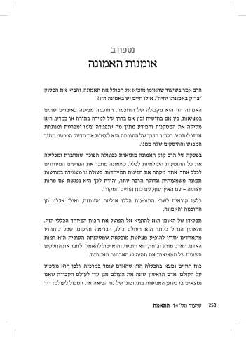 בפסקה של הרב קוק האמונה מתוארת כפעולה הפוכה שמחברת ומכלילה את כל התופעות העולמיות לכלל. כשאתה מחבר את הפרטים המיוחדים לכלל אחד, אתה מקהה את הפינות המייחדות. פעולה זו מעמידה במודעות תמונה משמעותית וגדולה הרבה יותר, והודת לכך היא נפגשת עם מהות