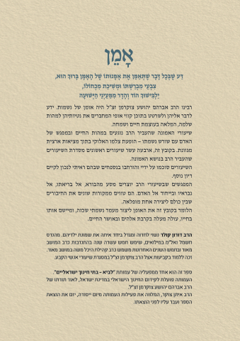 רבינו הרב אברהם יהושע צוקרמן זצ"ל היה אומן של נשמות. ידע לדבר אליהן ולשרטט בתוכן קווי אופי המחברים את נטיותיהן למהות שלמה, המלאה בעוצמת חיים ושמחה. שיעורי האמונה שהעביר הרב נוגעים במהות החיים ובמפגש של האדם עם שורש נשמתו - הופעת צלמו האלוקי בתוך מציאות ארצית מגוונת. בקובץ זה, ארבעה עשר שיעורים ראשונים מסדרת השיעורים שהעביר הרב בנושא האמונה. השיעורים סוכמו על ידיי והורחבו בנספחים שבהם ראיתי לנכון לקיים דיון נוסף. המפגשים שבשיעורי הרב יוצרים מסע מהבורא, אל בריאתו, אל נבראיו ובייחוד אל האדם. הם טווים ממקורות שונים את החיבורים שבין כולם ליצירה אחת מופלאה. הלומד בקובץ זה את האופן ליצור מעמד נשמתי שכזה, ומיישם אותו בחייו, עולה מעלה בקרבת אלהים ובאושר החיים.