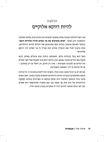 אני רוצה להוסיף הבחנה אחת בפסקה שהביא הרב מהרב קוק. בסיום הפסקה הראשונה הרב אומר: "שהם מזקיקים את בני האדם שיהיו אלהיים דוקא" (בקשר לאותם ארבעה כוחות נפש שמכוננים את הכלים לחיים הרוחניים). כעת ברצוני לברר את הנקודה שהרב קוק מגדיר כי בני האדם יהיו דווקא