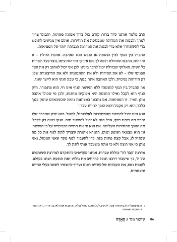 הוא אינו יכול להיפטר מהתמכרות לאלכוהול, למשל. הוא יודע שהכבד שלו נהרס וזה בזבוז כסף, אבל הוא לא יכול להיפטר מזה. הגוף רוצה רק לקבל, וזה ההפך מהחירות העליונה. אם הוא חי את החיים הפנימיים על פי הנשמה, אז הוא עצמאי ושופע ונותן. הגמרא אומרת שצריך לתת לגוף את כל מה שנחוץ לו, אבל קצת פחות מזה, כדי להעביר לגוף מסר שאני המנהל, ואני