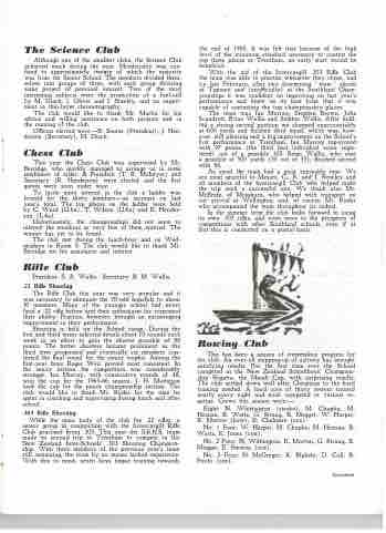 This has been a season of tremendous progress for the club. An over-all stepping-up of activity has brought satisfying results. For the rst time ever the School competed in the New Zealand Schoolboys' Champion ship Regatta, the Maadi Cup, with surprising results. The club settled down well after Christmas to the hard training needed. A hard core of thirty rowers trained nearly every night and most competed at various re gattas. Crews this season were:-