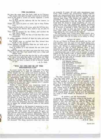 Firstly, I must dismiss any arguments based on tradition. Static tradition is merely an impediment to our reasoning. That the Cap was worn in the past is not in the least relevant. Many worthwhile traditions in the School have disappeared through a re ection of current trends, be they good or bad. There is no longer a school choir or orchestra; basketball and soccer are displacing rugby; Barracks Week has succumbed to reason. For the present, at least, hats have had their day. Virtually no-one in our age grOU wears a hat of any kind now except the eccentrics. This is, of course, indirectly su i cient reason for abolishing the Ca[. Nevertheless, allow me to assess the alleged practica value of this public school relic.