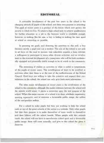 A noticeable development of the past few years in the school is the changing attitude of pupils to the school, and their own purpose in attending. The pupil of recent years is a product of the forces which now govern the society in which we live. To attend a high school only to achieve quali cations for further education or a job in the business world is creditable enough; however, in making this his aim, a boy is failing in making his time spent at school as rewarding as possible.