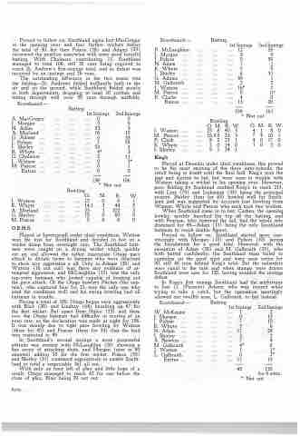 Played at Dunedin under ideal conditions, this proved to be the most exciting of the three inter-schools, the result being in doubt until the nal ball. King's won the toss and elected to bat, but were soon in trouble with Watson taking a wicket in his opening over. However, poor elding by Souhland enabled King's to reach 215, with Lees (79) and Joohnston (35) being the principal scorers. Shirley (four for 63) bowled well for South land and was supported by accurate fast bowling from Watson, Whyte and Pascoe who each took two wickets.