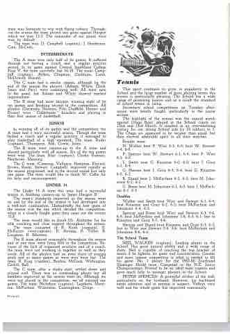 The highlight of the season was the annual match against Otago Boys' played at the School courts on 22nd and 23rd March. It resulted in an overwhelming victory for our strong School side by 19 rubbers to 2. The Otago six appeared to be weaker than usual, but they showed admirable spirit in all their matches.