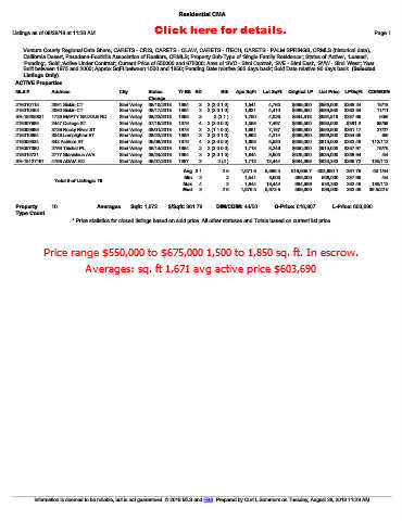 218009665  3736 Rocky River ST  Simi Valley  08/01/2018  1978  3  2 (1 1 0 0)  1,661  7,187  $599,900  $599,900  $361.17  27/27