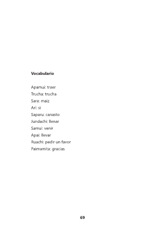 Vocabulario Apamui: traer Trucha: trucha Sara: maiz Ari: si Saparu: canasto Jundachi: llenar Samui: venir Apai: llevar Ruachi: pedir un favor Paimamita: gracias 69