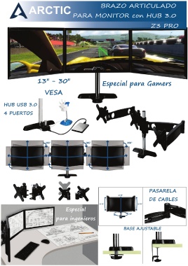 BRAZO ARTICULADO ARCTIC PARA MONITOR con HUB 3.0 Z3 PRO 13" - 30" Especial para Gamers VESA HUB USB 3.0 4 PUERTOS PASARELA DE CABLES Especial para ingenieros BASE AJUSTABLE