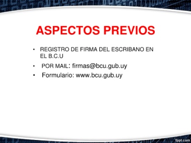 ASPECTOS PREVIOS • REGISTRO DE FIRMA DEL ESCRIBANO EN EL B.C.U • POR MAIL: firmas@bcu.gub.uy • Formulario: www.bcu.gub.uy