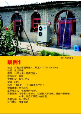 图片均实地拍摄 案例1 地址:河曲文笔镇焦尾村,周某(17735008000 ) 性质:生活采暖 面积:31 平方米(两间正房) 散热类型:地暖 安装机型:极光-2P 型 室温:23 ℃ 耗电:1850 度(一个采暖季五个月) 安装费用:16800 元 原采暖方式:小燃煤炉+火炕 安装原因:两个老人年龄大,取炭倒灰不方便,避免一氧化碳 中毒,并且可保证23 度恒温。 安装时间:2016 年 月8 运行情况:非常良好