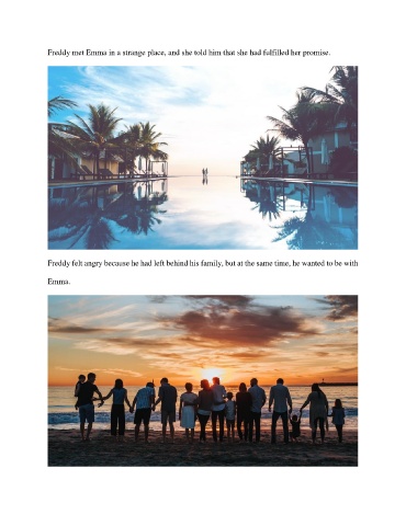 Freddy met Emma in a strange place, and she told him that she had fulfilled her promise. Freddy felt angry because he had left behind his family, but at the same time, he wanted to be with Emma.