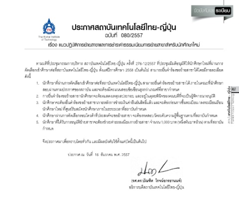 คัดเลือกเข้าศึกษาต่อที่สถาบันเทคโนโลยีไทย-ญี่ปุ่น ตั้งแต่ปีการศึกษา 2558 เป็นต้นไป สามารถยื่นค�าร้องขอย้ายสาขาได้โดยมีรายละเอียด