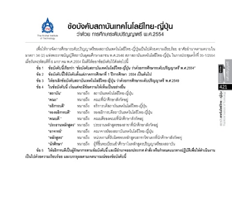 มาตรา 34 (2) แห่งพระราชบัญญัติสถาบันอุดมศึกษาเอกชน พ.ศ.2546 สภาสถาบันเทคโนโลยีไทย-ญี่ปุ่น ในการประชุมครั้งที่ 35-1/2554 ขอบังคับและ ระเบียบ
