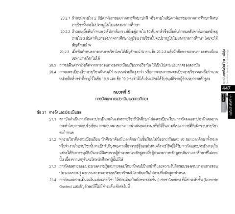 21.4 การวัดและประเมินผลในแต่ละรายวิชา ให้ประเมินเป็นอักษรระดับขั้น (Letter Grades) ที่มีค่าระดับขั้น (Numeric
