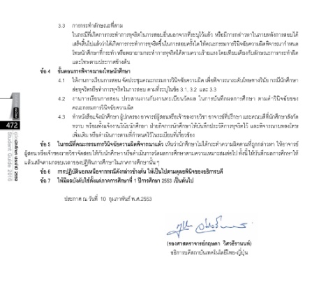 472 ทราบ พร้อมทั้งแจ้งงานวินัยนักศึกษา ฝ่ายกิจการนักศึกษาให้บันทึกประวัติการทุจริตไว้ และพิจารณาบทลงโทษ